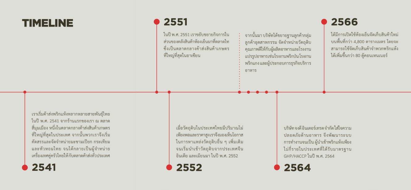 เราเริ่มค้าส่งพริกแห้งหลากหลายสายพันธุ์ไทยในปี พ.ศ. 1998 จากร้านแรกของเรา ณ ตลาดสี่มุมเมือง หน่ึงในตลาดกลางค้าส่งสินค้าเกษตรท่ีใหญ่ท่ีสุดในประเทศ จากน้ันพวกเราจึงเร่ิมคัดสรรและจัดจําหน่ายมะขามเปียก กระเทียม และหัวหอมไทย จนได้กลายเป็นผู้จําหน่าย เครื่องเทศคู่ครัวไทยให้กับตลาดค้าส่งท่ัวประเทศ